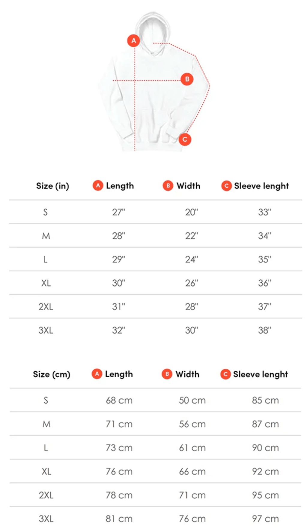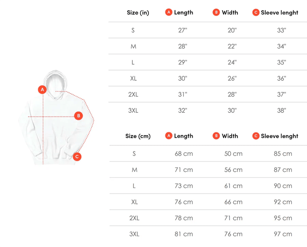 Our hoodies come in S to XXXL unisex sizing. Check the size chart for precise measurements.